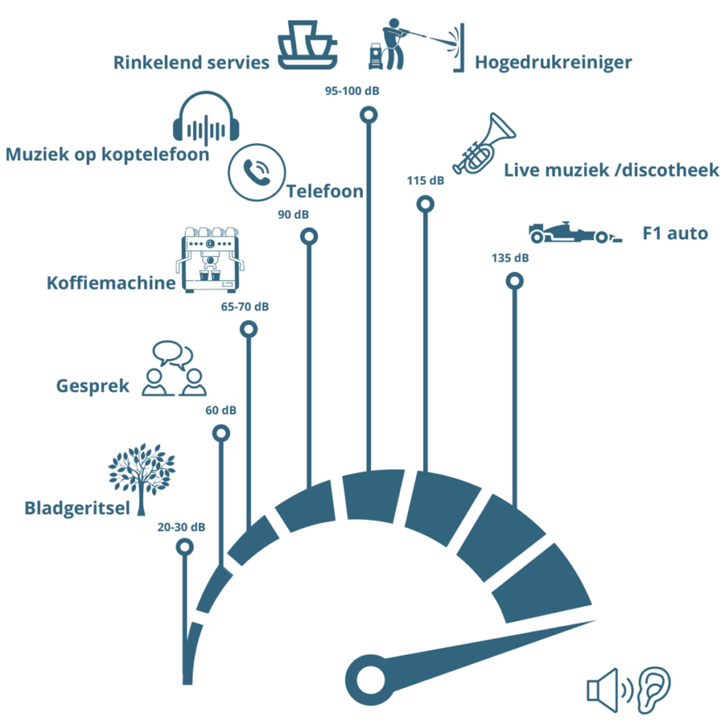 Het geluidsniveau wordt gemeten in decibel (dB). Om rekening te houden met hoe het oor verschillende frequenties waarneemt, gebruiken we een A-filter bij het meten van geluid, wat wordt aangeduid als dB(A). Als je 8 uur lang wordt blootgesteld aan 80 dB(A), dan zal het geluidsniveau na 4 uur stijgen naar 83 dB(A), maar alleen als het geluidsniveau gedurende de andere 4 uur veel lager is. Als je een idee wilt krijgen van hoe luid 80 dB(A) is, kun je deze vuistregel gebruiken: als je iemand op 1 meter afstand niet meer kunt verstaan, is de kans groot dat het geluidsniveau boven de 80 dB(A) ligt.